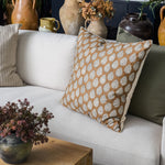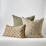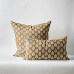 Handsewn brown block print linen blend pillow with exposed gold metal zipper on a neutral back. Faux down insert included. 100% polyester fiber filling.