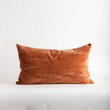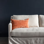 Handsewn coral crushed velvet pillow with exposed gold metal zipper on a neutral back. Faux down insert included. 100% polyester fiber filling.