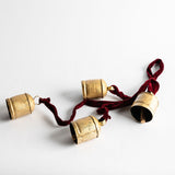 Four metal bells hanging from velvet ribbon.