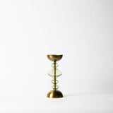 Recycled green glass and metal pillar holder in antique brass finish. Holds 3" pillar candle.